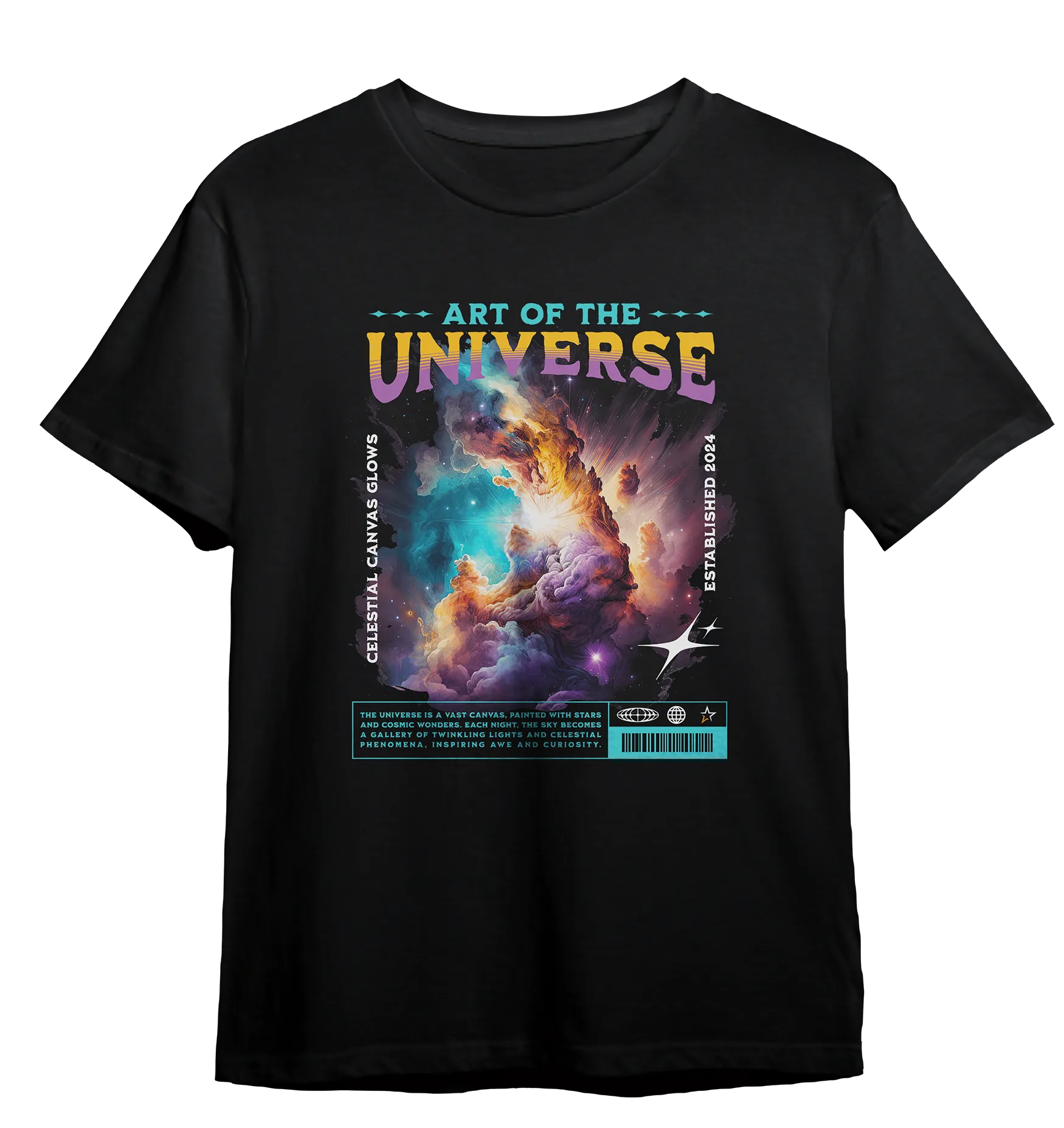 A Camiseta Art of the Universe nasce da ideia de que o cosmos é a maior obra de arte já criada. Um espetáculo silencioso, em constante transformação, onde cores, luz e profundidade se encontram muito além da imaginação humana.